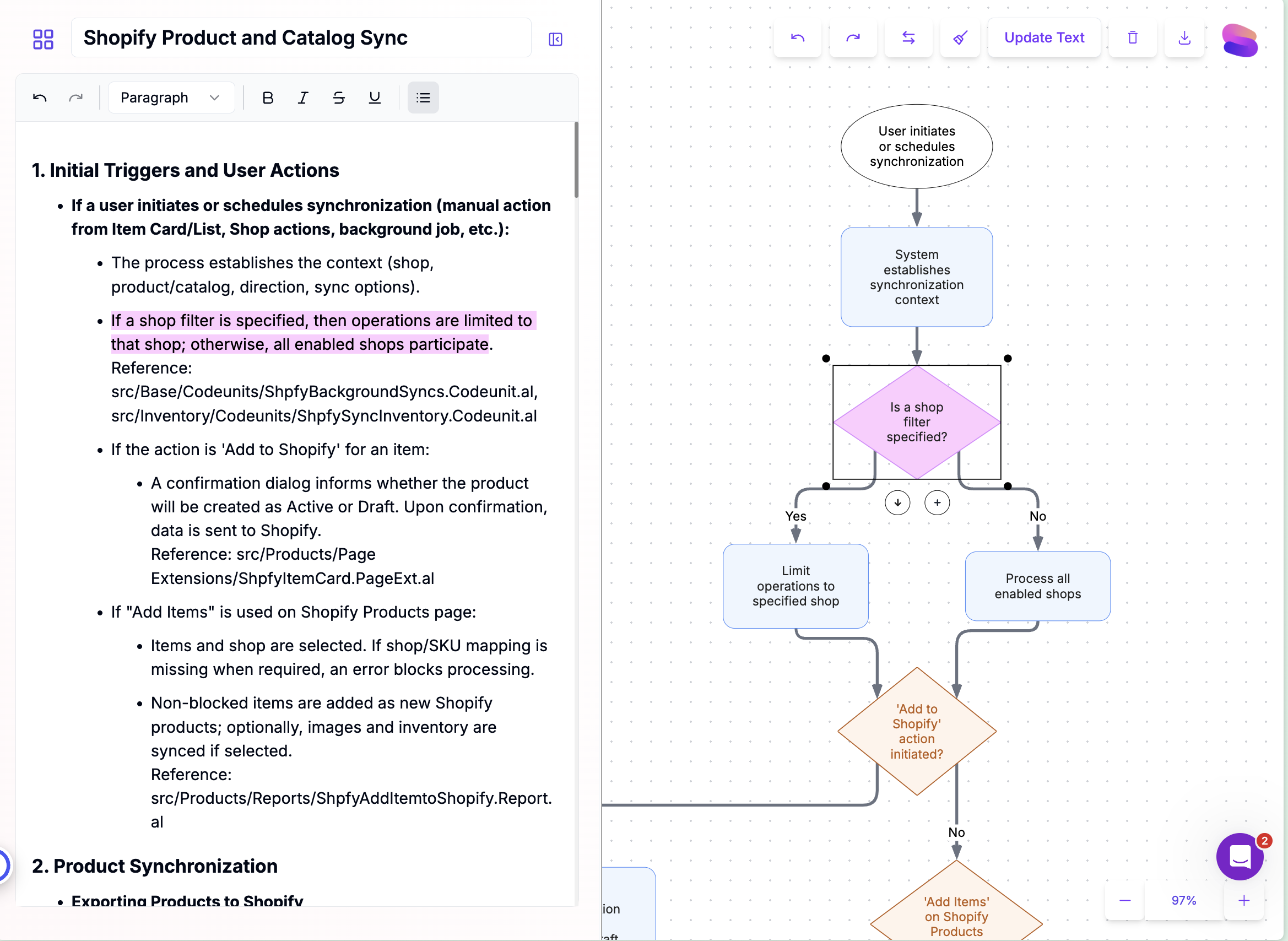 - Connect & scan. We pull implementation artifacts (configuration, workflows, comments) so the generator knows what’s in play.